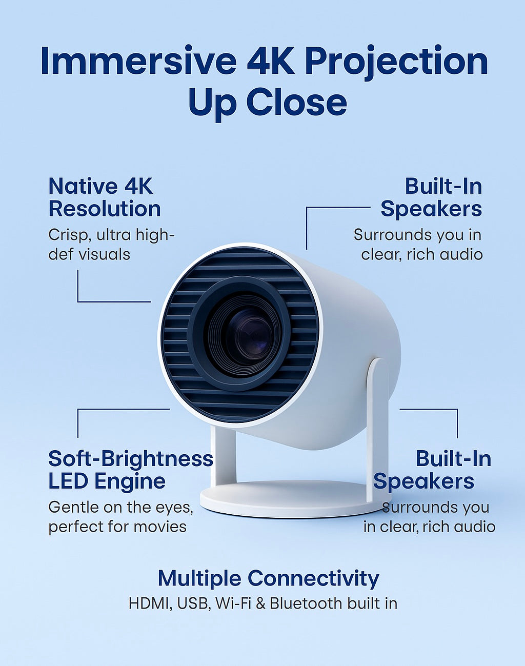 • Native 4K projection for crystal-clear images • Soothing soft-brightness LED engine • Built-in speakers plus optional Bluetooth pairing • Preloaded streaming apps for instant enjoyment